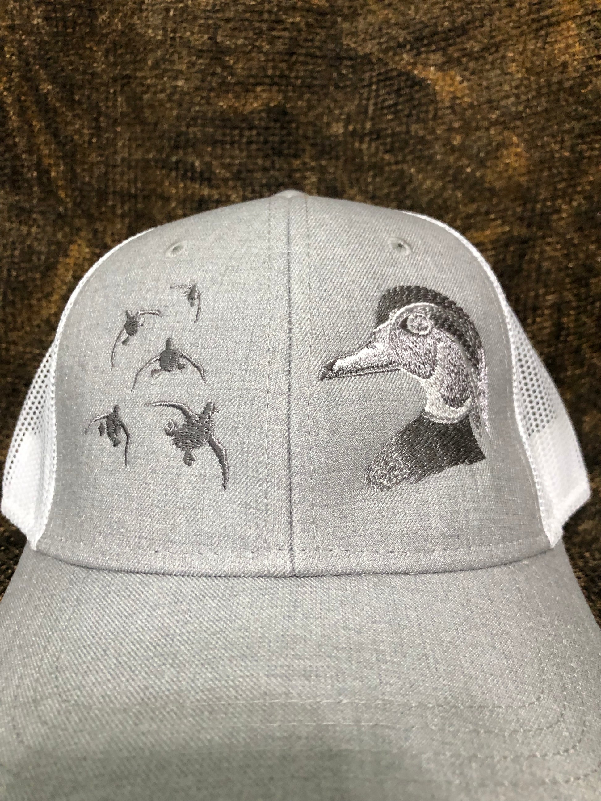 Heather Gray with White mesh back 6 panel Richardson cap with snap back. Dark Gray and White Wood Duck embroidered on left front along with Landing Ducks embroidered in Dark Gray on the right front.